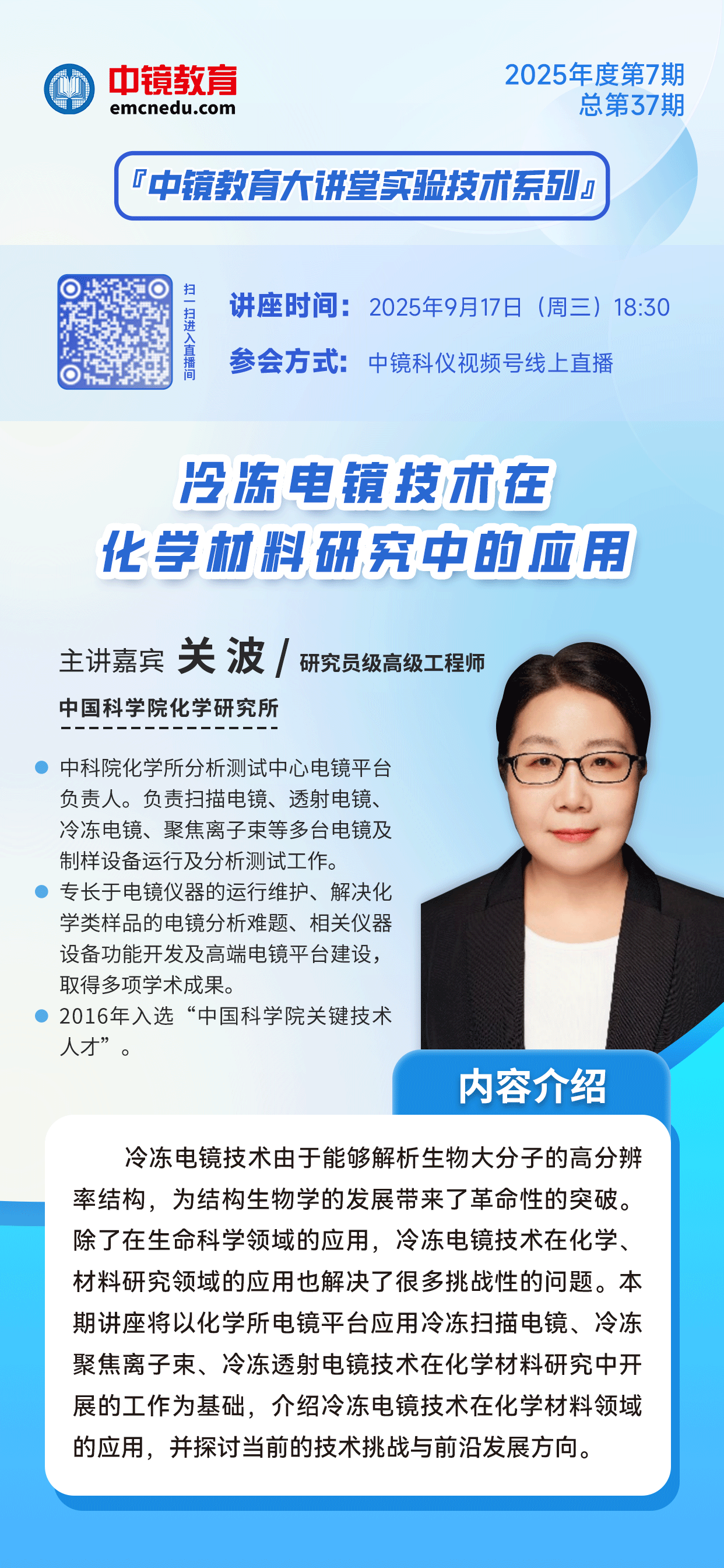 中鏡教育大講堂 2025年“中鏡教育大講堂”第7期-“實驗技術系列”講座將于2025年9月17日18:30開講。本期由中國科學院化學研究所分析測試中心電鏡平臺負責人、項目研究員級高級工程師關波老師帶來的《冷凍電鏡技術在化學材料研究中的應用》專題講座,將以化學研究所電鏡平臺應用冷凍掃描電鏡、冷凍聚焦離子束、冷凍透射電鏡技術在化學材料研究中開展的工作為基礎,介紹冷凍電鏡技術在化學材料領域的應用,并探討當前的技術挑戰與前沿發展方向。歡迎大家積極參與,共同推動實驗技術的發展! 講座時間: 2025年9月17日(周三)18:30 掃碼進入微信視頻號