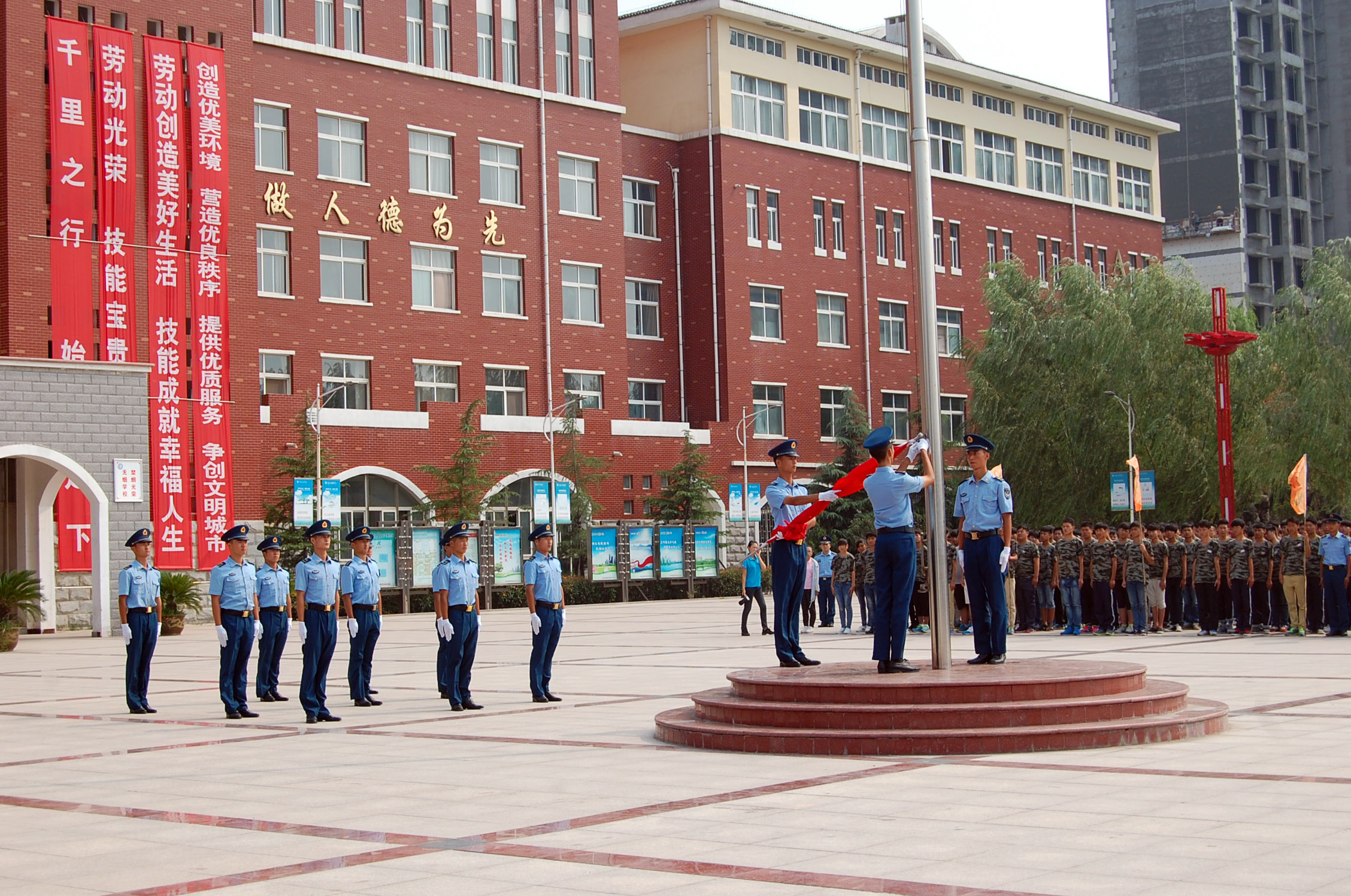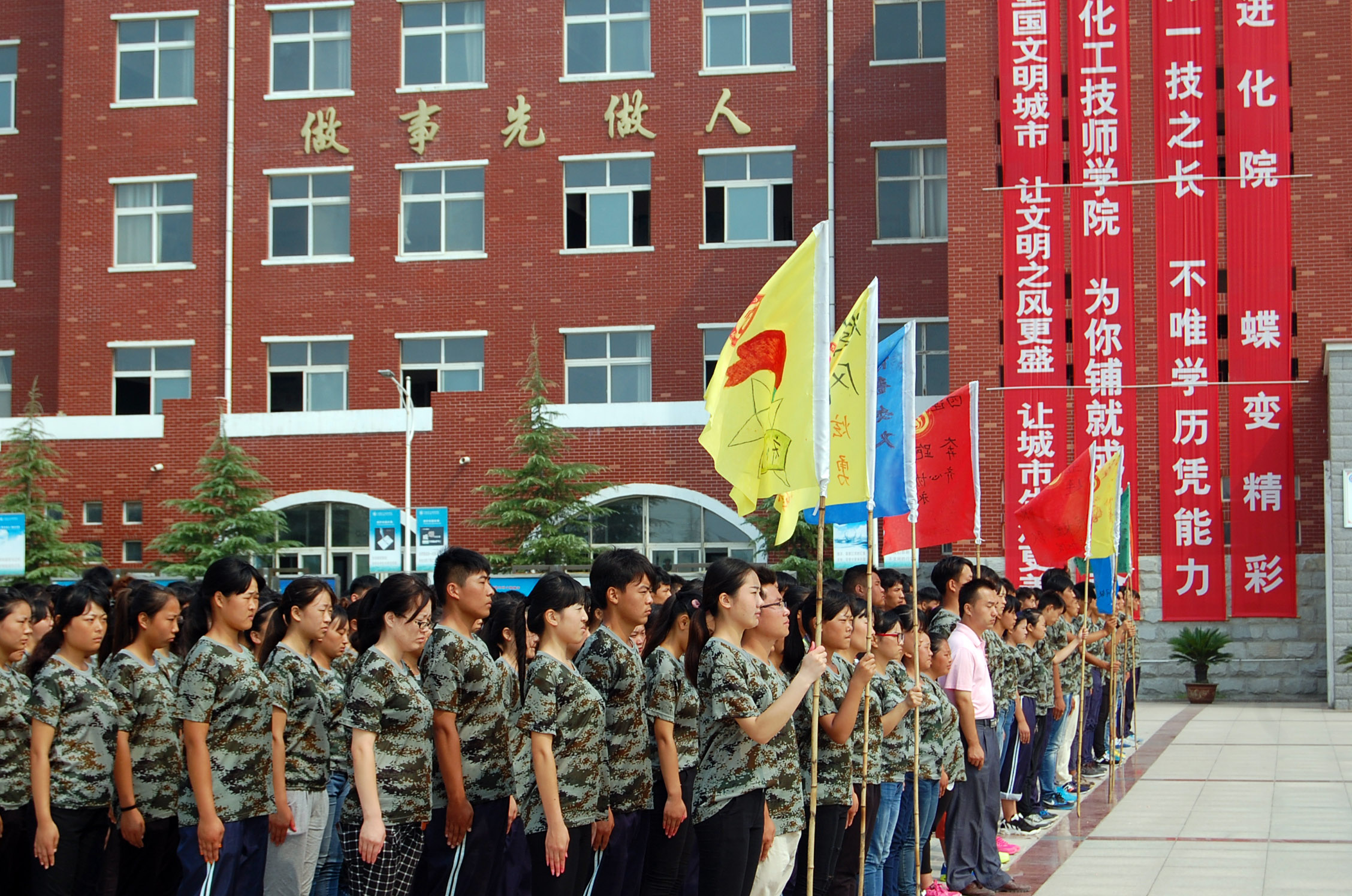 爽朗的八月,電鏡班迎來了新的面孔,他們告別了天真爛漫的中學時代,懷著一份決心,一份希望,一份好奇來到了河南化工技師學院。作為一年級新生,將面臨著軍訓的嚴峻考驗,十五天的軍訓生活將成為同學們未來三年的基礎,它將教同學們怎樣嚴格要求自己。 對于一個滿懷憧憬的新生,軍訓可以考驗同學們的毅力和意志,培養一種吃苦耐勞、積極向上的精神。站在火紅的軍旗下,我們所有新生身穿綠色軍服,以一種雄赳赳,氣昂昂的軍人姿態屹立在驕陽之下。軍訓作為入學生活中的第一課,同學們決心用自己的努力,用自己的良好習慣度過這十五天特殊的生活。 疊被子是新生軍訓整理內務中的一項重要內容,但要在最短的時間內將被子疊的棱角分明,干凈漂亮,則需要掌握一定的技巧和反復不斷地練習。 8月26日下午,在學院西操場舉行15級新生疊被子比賽。一天的軍訓結束后,同學們帶著自己的涼席和被子來到操場,比賽開始,上千人同時疊被子的場面著實令人震撼。 疊被子比賽留影 周一早九點,微風和煦,歌聲嘹亮。同學們踏著堅定地步伐,氣宇軒昂、精神飽滿的準時來到軍訓的操場準備升旗儀式。 升旗儀式在主持人的宣布下正式開始。駐汴95936部隊為我校新生做國旗護衛隊,高昂的胸膛,嘹亮的口號,豪邁的步伐,彰顯著教官們獨有的風采。 升國旗,奏國歌。隨著國歌的響起,旗手將旗幟拋向空中,全體人員向旗幟致以最崇高的軍禮。國旗下學校領導講話鼓舞人心,催人奮進,給同學們很大的精神鼓勵;學生代表們語氣豪邁,字字鏗鏘有力,流露出滿腔的愛國、愛校情懷。 8月28日下午,新生向學校、部隊領導及老師們匯報了訓練成果,校領導和軍區領導共同檢閱了軍訓團。方陣表演展示出學子們這些天來的汗水結晶。軍訓方陣口號嘹亮走過主席臺,颯爽英姿引來場上師生的陣陣掌聲。 15級新生方陣表演 軍訓帶給了同學們深刻的體驗,也留下了美好的記憶,希望同學們在未來的求學路上無論遇到多大的困難都能夠擁有堅定的信念,不被困難和挫折壓倒。