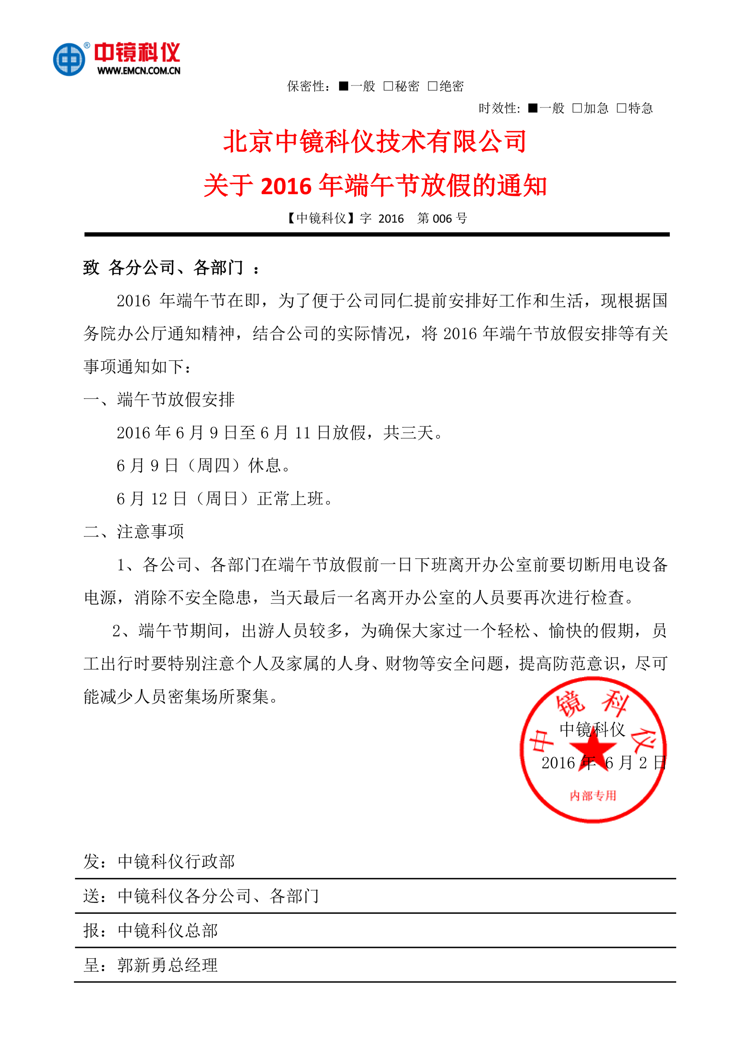 北京中鏡科儀技術有限公司關于2016年端午節放假的通知