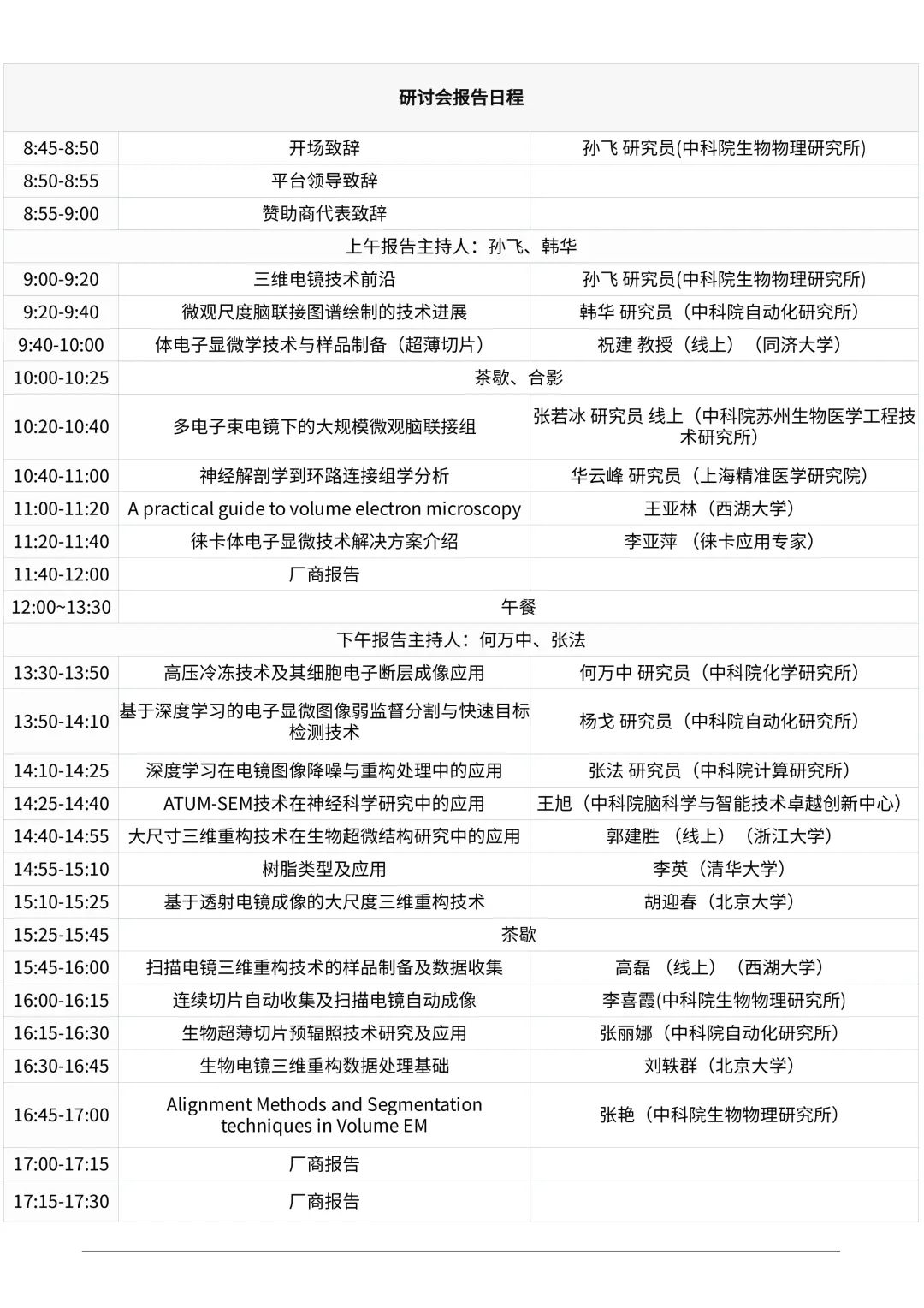 體電子顯微學(Volume Electron Microscopy,VEM)主要是對樹脂包埋樣品,通過連續超薄切片及序列成像;掃描電鏡原位塊表面序列成像;掃描電鏡原位聚焦離子束序列切割成像等不同技術手段,并通過后期圖像處理和結構分割等手段,獲得大體積高分辨率電子顯微體數據的方法。本次研討會主要設以下幾個方向: