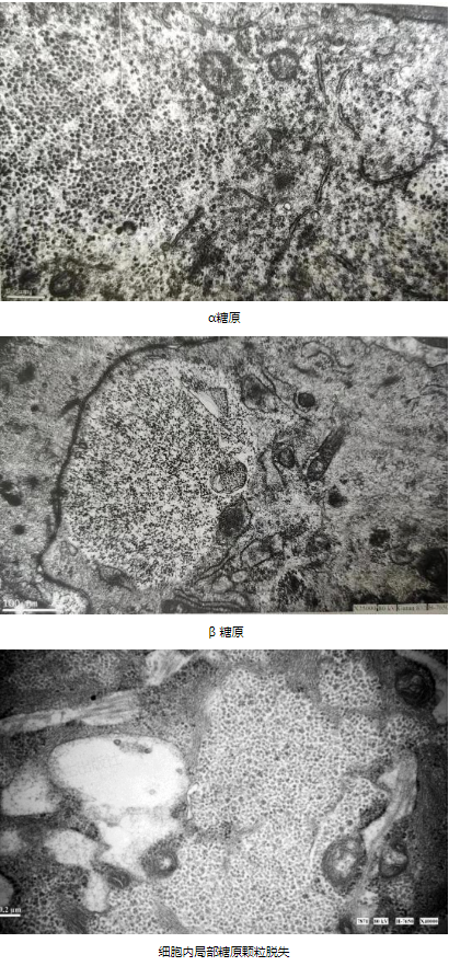 糖原(Glycogen)是一種多聚糖,是由葡萄糖分子通過α-1,4-糖苷鍵和一些α-1,6-糖苷鍵連接而成的大分子。糖原合成于細胞質,是細胞的能源儲存。糖原顆粒可以散在或成堆分布于細胞質內,也偶見于細胞核、線粒體及內質網等細胞器中 。在電子顯微鏡下觀察,糖原為無被膜包裹的無定型顆粒,α糖原顆粒較大約100nm,呈玫瑰花簇樣結構,而 β糖原顆粒呈圓形較小約40nm,一般認為 α糖原顆粒由 β 糖原顆粒聚集而成。