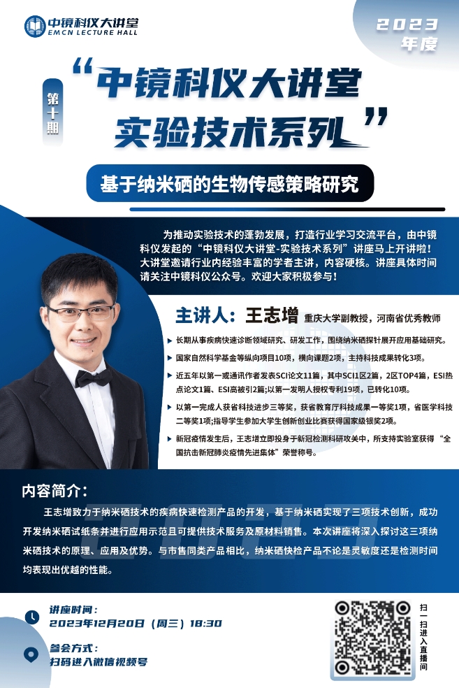 中鏡科儀大講堂-實(shí)驗(yàn)技術(shù)系列視頻回放 第十期:基于納米硒的生物傳感策略研究 為推動(dòng)實(shí)驗(yàn)技術(shù)的蓬勃發(fā)展,打造行業(yè)學(xué)習(xí)交流的平臺(tái),由中鏡科儀發(fā)起的2023年“中鏡科儀大講堂”第十期-“實(shí)驗(yàn)技術(shù)系列”講座圓滿結(jié)束! 近年來(lái),納米硒在抗菌方面的應(yīng)用被廣泛研究,納米硒作為廣譜抗菌劑具有巨大潛力,對(duì)病原細(xì)菌、真菌和寄生蟲(chóng)具有重要的抗菌活性。本期特邀王志增教授為我們帶來(lái)了《基于納米硒的生物傳感策略研究》的專題講座。講座圍繞納米硒的三項(xiàng)技術(shù)創(chuàng)新展開(kāi)深入探討,并分享了他在納米硒醫(yī)學(xué)生物傳感研究方面所取得的最新研究成果和應(yīng)用實(shí)例。內(nèi)容詳實(shí),深入淺出,精彩非凡! 現(xiàn)將本期講座回放發(fā)布,供大家學(xué)習(xí),歡迎大家觀看!