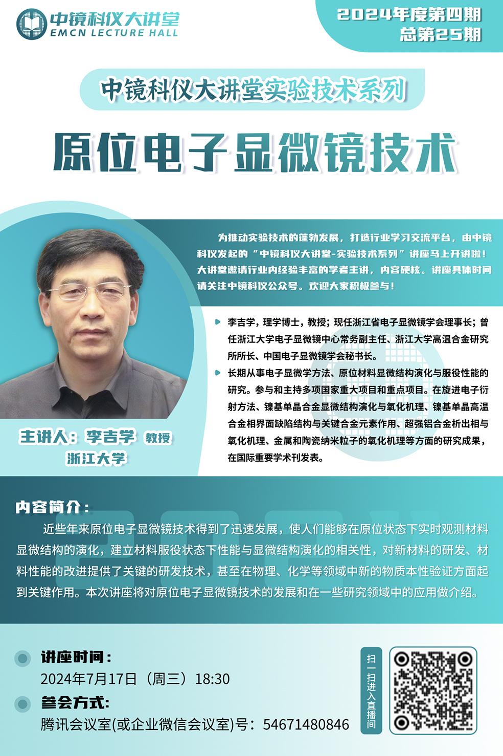 中鏡科儀發(fā)起的2024年“中鏡科儀大講堂”第四期-“實驗技術(shù)系列”講座將于2024年7月17日18:30開講。本期由李吉學教授帶來的《原位電子顯微鏡技術(shù)》專題講座將詳細探討原位電鏡技術(shù)的最新發(fā)展和應用。歡迎大家積極參與,共同推動實驗技術(shù)的發(fā)展! 講座時間: 2024年7月17日(周三)18:30 參會方式: 騰訊會議室(或企業(yè)微信會議室)號:54671480846 掃碼進入微信視頻號 掃碼關注中鏡科儀
