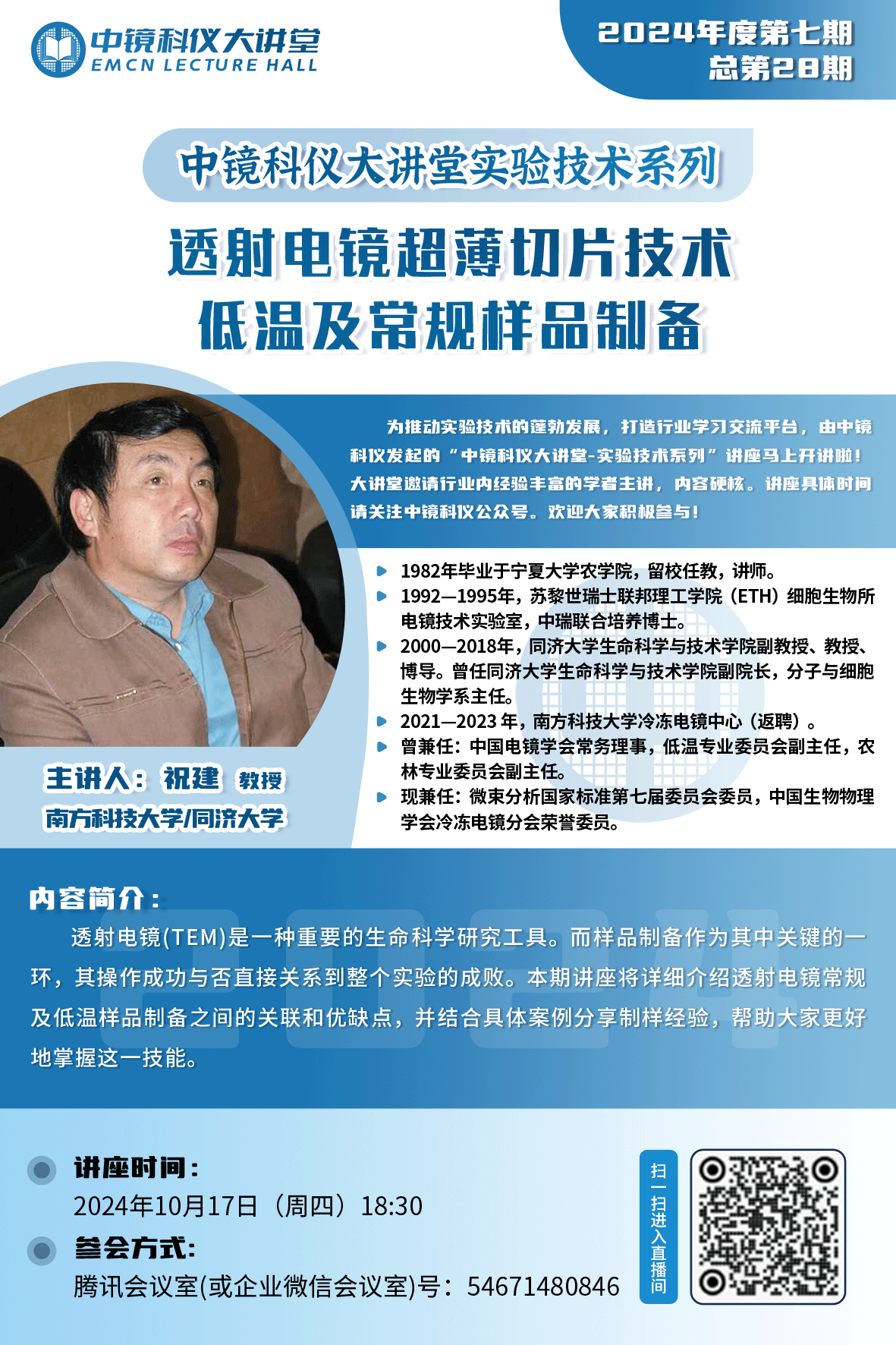 第七期:透射電鏡超薄切片技術—低溫及常規樣品制備 為推動實驗技術的蓬勃發展,打造行業學習交流的平臺,由中鏡科儀發起的2024年“中鏡科儀大講堂”第七期-“實驗技術系列”講座圓滿結束! 透射電鏡(TEM)是一種非常重要的生命科學研究工具,它能夠提供關于樣品內部結構和成分的詳細信息,要想從透射電鏡中獲得高質量的圖像,樣品制備是非常關鍵的一環。本期特邀祝建教授為我們帶來了《透射電鏡超薄切片技術—低溫及常規樣品制備》的專題講座。講座圍繞透射電鏡常規及低溫樣品制備之間的關聯和優缺點,結合具體案例和制樣經驗進行深入探討。內容詳實,深入淺出,精彩非凡! 現將本期講座回放發布,供大家學習,歡迎大家觀看!
